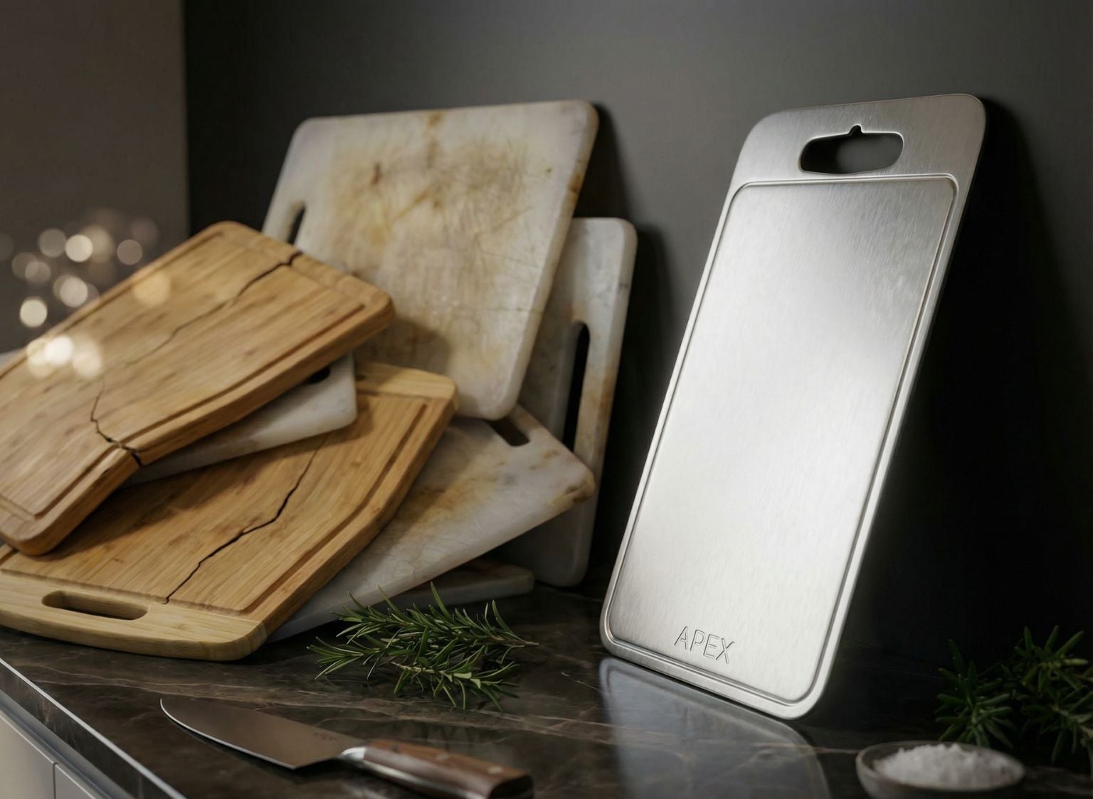 The Difference: Knife marks on plastic and wood create "valleys" where bacteria hide. Apex Titanium resists deep scoring, meaning food residue rinses off in seconds.
